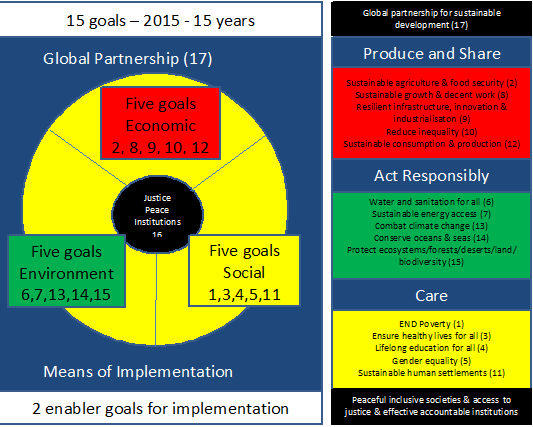 These 15 goals, plus two enablers, could be summarized as follows: Produce and Share (sustainable inclusive growth coupled with reducing inequality through means of food security and sustainable agricultural production, infrastructure building, innovation and industrialization matching sustainable consumption and production); Act responsibly (through ensuring water and sanitation for all, sustainable energy access, combatting climate change, conserving oceans and seas, and protection of ecosystems, forests, deserts, land and biodiversity); Care (through ending poverty, living healthy lives, lifelong learning, gender equality and sustainable human settlements). Make it possible through: access to justice, peaceful inclusive societies, effective accountable institutions and global partnership (see Figure).