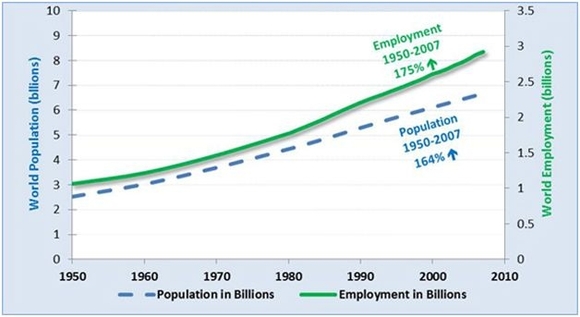 Data from U.S. Census Bureau (2010) ‘U.S. and World Population Clocks.’ See also ILO (2005) ‘World Employment Report 2004–05 Employment, Productivity and Poverty Reduction.’ Geneva: ILO, p.111. (World employment in 1950 is based on economically active population for age 15+ assuming unemployment averaged 6.4%). See also International Labour Organization (2011) ‘Laborsta EAPEP. Economically Active Population Estimates and Projections 1980–2020.’ILO. (World Employment for 1980-98 is based on economically active population aged 15+ assuming unemployment averaged 6.4% during the period). See also International Labour Office (2010) ‘Global Employment Trends.’ Geneva: ILO, January.