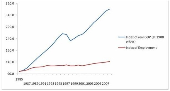 Although GDP growth contributed to the increase of job creation, economic growth does not automatically lead to more jobs, nor does it guarantee better paying jobs. For example, despite impressive economic growth rates in emerging markets like China, with a GDP growth on average of about 10% a year since 1978, and Brazil with around 5% growth yearly since 2004, and India with several peaks of 10% yearly since the 1980s; 11 many people in these countries still face unemployment or have to work under poor conditions in the informal sector. 12 Most of the employment creation in emerging economies has not resulted in formal jobs that provide access to employment rights and benefits and social security, as Sandrine Cazes and Sher Verick show in their 2013 book, The Labour Markets of Emerging Economies: Has Growth Translated into More and Better Jobs? 13