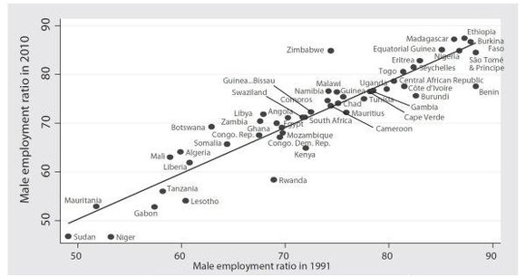 For example, China expected to increase jobs through economic growth. Yet, the amount of jobs actually created (even -2.5% in some regions in 2012), did not increase at the same pace as the GDP growth (7.8% in 2012).jj If growth and work were indeed so correlated, the actual number of jobs created in China would be the result of a much lower growth, namely 2%. The same disappointing ratios of employment creation to GDP growth can be seen around the world in both the developed and less developed world, for example in Thailand (figure 2 in box 2.), South Africa, Turkey, 15 the UK, and France (figure 3 in box 2.). Even in Africa, a continent with high GDP growth rates in many countries, the male employment ratio did not significantly increase between 1991 and 2010 (figure 4 in box 2.). Take for example emerging Kenya where the ratio decreased from 72% in 1991 to 64% in 2010.