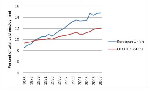 As we see in figure 2, temporary employment has increased steadily in OECD countries since the 1980s and constituted 12% of all employment in 2007. By only looking at figures up to 2007, we maintain an overview of the broad trends and not of the effects the subsequent economic crisis had. In the European Union the rise of temporary work increased with 115% as compared to 26% for overall employment. 14 The figures are even more pronounced for the youth in Europe, where part-time employment was 25% in 2011. Another 40.5% of employed youth in the region worked on temporary contracts. 15