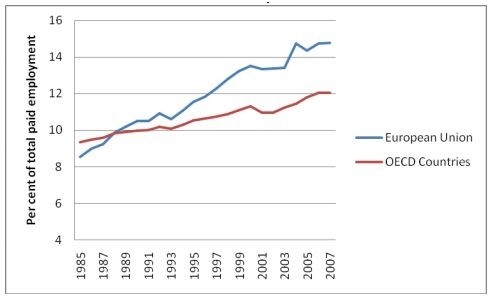 While highly-regulated labour markets were well suited to the relatively closed economies of the period up to the 1970s, the intensity and range of competition since the onset of globalization has called for more adaptable production systems and labour markets. Neoclassical economists argue that such flexibility is an inherent precondition for employment creation and economic growth in today’s global economy. 1 Dynamics over the past three decades have challenged what Leah Vosko, Professor in Feminist Political Economy at York University, calls the existing ‘standard employment relationship’ (SER). Reliance on a traditional relationship between employer and employee, structured in a permanent and full-time contractual engagement, proved no longer suitable to cope with the new pressures and demands of the global economy. These include outsourcing production processes across borders and competitive pricing enforced by growing international competition. This has led to a decline in the significance of full-time and permanent employment in favour of the expansion of ‘non-standard’ flexible forms of employment, such as temporary and part-time work. 2