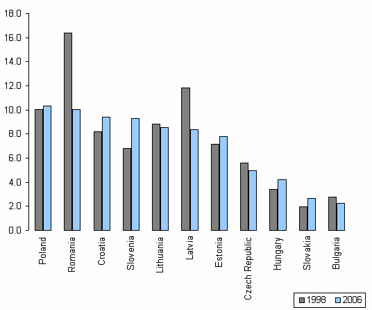 Another phenomenon that can be measured is part-time work, which can indicate a precarious working situation, especially when it is involuntary. Not many data are available on the number of people who involuntarily have a part-time contract, but OECD calculations show that the number of people with part-time contracts in developed regions has increased in recent decades. 13 In 1985, around 9% of workers in OECD countries had part-time jobs, while this had increased to 12% by 2007. According to John Evans and Euan Gibb, part-time work is generally higher among the elderly, young people and women. 14 The ILO calculates that in 2011 a quarter of employed youth worked part-time and often involuntarily. 15 One study shows that 22% of part-time work in advanced economies is involuntary, 40% is due to ‘family or personal responsibilities’, and about one-third is voluntary. The proportion of involuntary part-time work suggests that it is not always a choice but a refuge from unemployment. 16 The ILO attributes the trend of more part-time work to “the increase in the number of women in the labour market, but also to attempts to introduce labour market flexibility in reaction to changing work organization within industry and to the growth of the services sector.” 17 In transition economies in Eastern Europe, the incidence of part-time employment between 1991 and 2006 shows a mixed picture. In some countries, most notably Slovenia, part-time work increased, but in others, especially Romania, it sharply decreased, as can be seen in figure 3.
