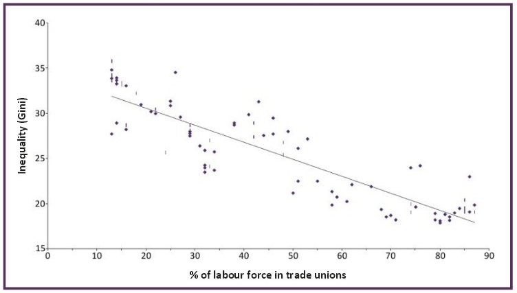 This is where trade unions step in. Richard Wilkinson and Kate Pickett, authors of the bestselling book The Spirit Level on the social impact of increasing inequality on society, conclude in a new paper that the widening income gap “seems…to reflect a lack of any effective democratic constraint on top incomes”. 48 ‘Democratic constraint’ refers mainly to the labour movement and the role it played in reducing inequality, increasing job security and securing labour protection schemes during the 20th century. The weakening of the labour movement in the last quarter of that century has had a significant impact on the ability of working people to influence their standard of living and quality of life.