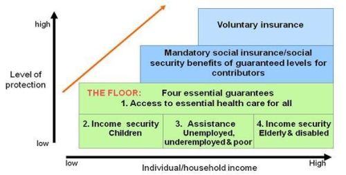 The idea of a social protection floor, developed by the ILO, envisages basic social security for everybody and therefore falls in the category of universal social protection. It would guarantee income security such as pensions and unemployment benefits as well as universal access to social services such as health, education, food security and housing.