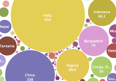 Part of a rendering of IDS data on population living under $1.25 a day in millions of people, mapped by Many Eyes. View full interactive version.
