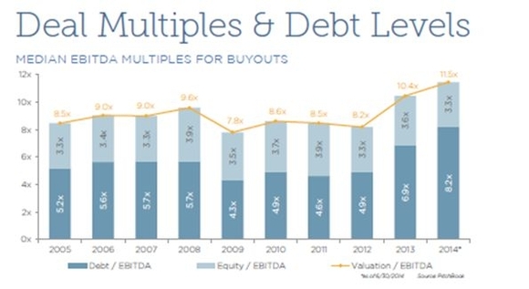 Private equity firms are paying a hefty 11.5 times earnings for companies now – up from 9.6 times earnings in 2008. Median debt is 8.2 times earnings– far above the 6 times earning suggested as the limit for debt in the guidelines on leverage issued by bank regulators.