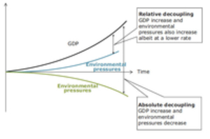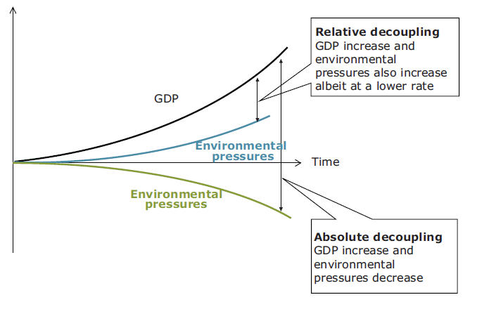 UNEP’s starting point is a distinction between economic and physical growth: the former refers to an increase in GDP or similar measure of economic value, the latter the material inputs that provide the basis for this value. The case for decoupling is then grounded in a series of key conceptual distinctions. The first is between relative and absolute decoupling. Relative decoupling is defined by UNEP in its 2011 report as a reduction in “the rate of use of (primary) resources per unit of economic activity”, and absolute decoupling describes an overall decrease in resource use even as the total economy grows.