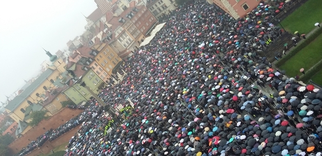 Heading towards Castle Square to join the main demonstration, I was expecting just another rally of a couple of thousand people: such demonstrations had been organized in the spring and early autumn, after the proposal to ban abortion was announced. However, history proved me wrong. The closer I got to the square, the thicker the crowd grew and, long before I reached my destination, all I saw around me were women clad in black, their umbrellas the only splash of colour on the streets, many carrying handmade banners with phrases such as ‘Fighting Polish woman!’, ‘The government is not a pregnancy – it can be easily removed’, or ‘Keep your rosaries out of my ovaries!’. When I finally managed to get to the terrace at the top of a nearby tower, the view was simply breath taking: tens of thousands of protesters had already gathered and more people were coming from every direction, like a black sea swarming Castle Square. The sound was like a football stadium on game night: the powerful roar of angry crowds like the rolling of thunder, energy vibrating in the air. Was this a revolutionary moment? It certainly felt like one.