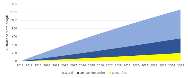 Africa’s population is the fastest growing in the world. It is expected to increase by roughly 50% over the next 18 years, growing from 1.2 billion people today to over 1.8 billion in 2035. In fact, Africa will account for nearly half of global population growth over the next two decades (see Figure 1), and West Africa alone for about 15%. West Africa’s population accounts for about 30% of Africa’s population. From roughly 367 million people today it is expected to increase to almost 570 by 2035.