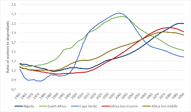 Cape Verde, a lower middle-income yet highly urbanised economy, is an exception. With fertility rates around replacement level, the West African country is experiencing a demographic dividend that is likely to hold over the coming five decades or longer. Figure 2 compares the demographic dividend of Nigeria, South Africa and Cape Verde with the average for Africa’s low and lower middle-income groupings.