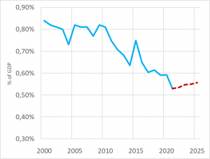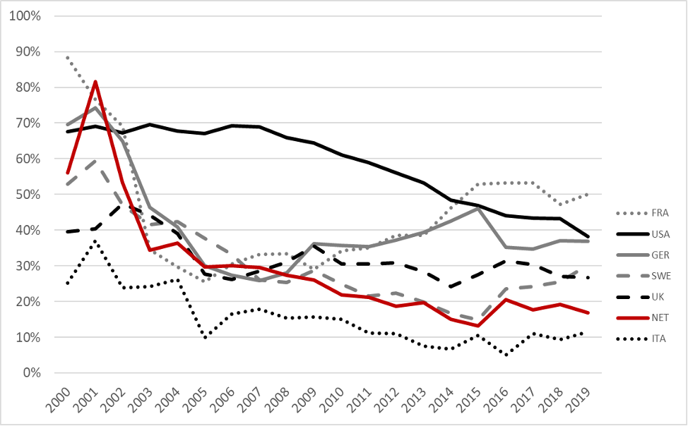Thanks to a growing economy, Dutch ODA spending has remained relatively stable over the past decade in absolute terms: fluctuating around EUR 4.5 billion (see Figure 2). Although the 2022 budget will most likely continue to secure the Netherlands a place among the top 10 global donors, its relative significance in global ODA spending has gradually eroded. Whereas Dutch ODA spending, in absolute terms, was consistently 50% higher than Sweden’s in the 2000s, today Sweden, a much smaller economy, outspends the Netherlands.