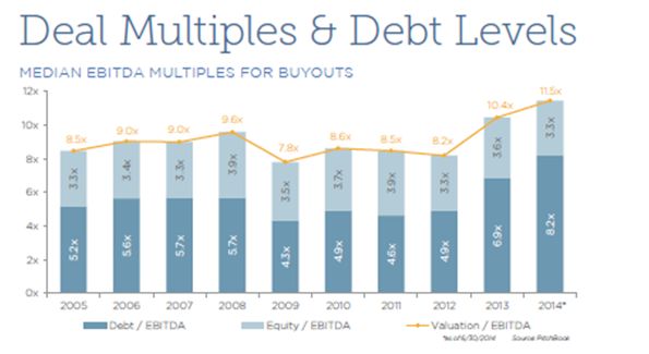 Private equity firms are paying a hefty 11.5 times earnings for companies now – up from 9.6 times earnings in 2008. Median debt is 8.2 times earnings– far above the 6 times earning suggested as the limit for debt in the guidelines on leverage issued by bank regulators.