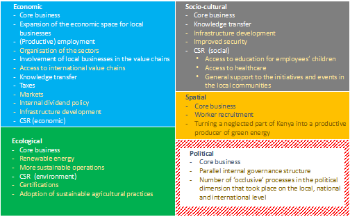 In the studied cases, ‘occlusive’ processes occurred during the initial stage of foreign private sector establishment in Kenya. These processes were ‘occlusive’ in nature, as they happened behind closed doors among groups of carefully selected strategic actors. They required strong personal networks, as well as an active engagement of the studied Dutch companies with the international, national and local governments. For instance, in the flower sector, a small group of international breeding companies took over the key regulatory role in the sector. This led to the creation of an exclusive and ‘occlusive’ governance structure within the sector. In the case of LTWP, it was the local networks built over the years by the project’s ‘founding fathers’ that proved to be a critical factor in the project’s success. The LTWP chronology illustrates a number of ‘occlusive’ processes in the political dimension that took place on the local, national and international level during the project development. These exclusive and ‘occlusive’ processes – which occurred in the case of LTWP, but also in the two other studied cases – did, however, lead to some inclusive outcomes in the longer-term. Concequently, these findings confirm that ‘occlusive’ processes constitute an integral and (so far) inseparable part of the development process that lead to inclusive outcomes.