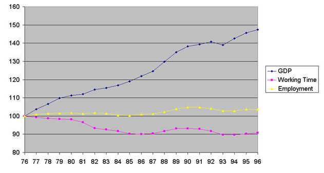 Figure 3. GDP, Working Time and Employment in France. Source: Pianta, M. and Vivarelli, M. (1996) ‘Unemployment, Structural Change and Globalization.’ ILO.