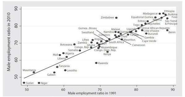 Figure 4. Male Employment Ratios between 1991 and 2010 in African Countries. Source: ILO database (2012), in: Kariobangi (2013) Africa is rising. Employment is not.