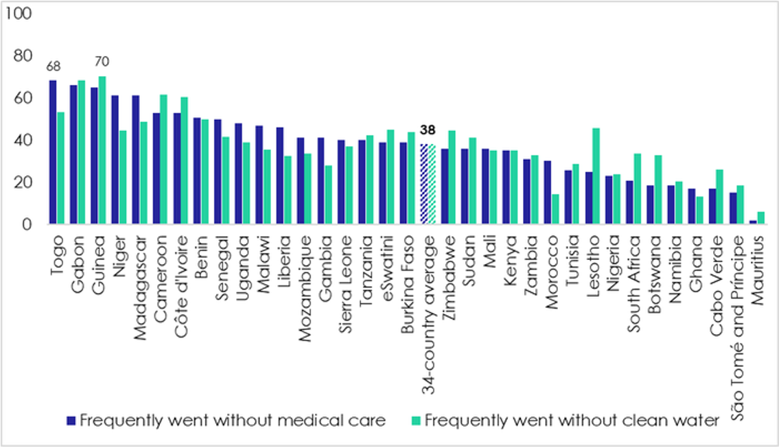 A summary table here captures some of these vulnerabilities. All of the 34 surveyed countries have at least one point of vulnerability. Even Mauritius and Botswana, which score in the best-performing third on four indicators of health-care quality, are average or worse in terms of the numbers of people in vulnerable occupations. And the situation is far more dire elsewhere. Togo and Zimbabwe score in the middle or bottom category on all five indicators of vulnerability. And even in countries scoring in the top third, levels of vulnerability may still be very high (e.g. up to one in three citizens who went without water or medical care).