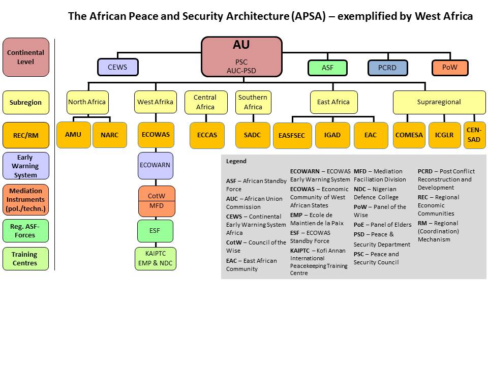 Beyond national peace initiatives, peace and security in Africa are primarily managed by African regional organizations under the umbrella of the so-called African Peace and Security Architecture (APSA). The APSA is a complex, comprehensive collective security system and includes the AU along with several Regional Economic Communities (RECs) and regional peacekeeping training centres. The Protocol establishing the Peace and Security Council of the AU provides the legal foundation for APSA. The central APSA instruments – mirrored at the AU and the RECs levels – are the Peace and Security Council (PSC), Continental Early Warning System (CEWS), mediation structures, the African Standby Force (ASF) and the African Peace Fund. In West Africa, APSA is represented by ECOWAS.