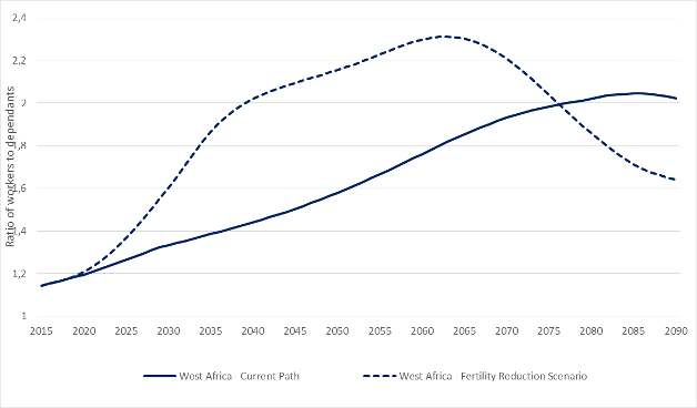 It is possible to speed up the demographic transition in West Africa’s low and lower middle-income economies to create greater opportunities for economic growth and development. If countries in the region dramatically reduced these over the coming two decades, they could benefit from an earlier onset – as well as a larger – demographic dividend and, with the right policies, capitalise on it to boost growth (see Figure 3).