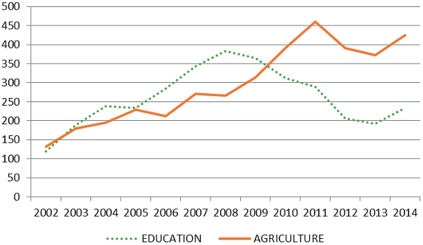 Change in official development assistance paid in the Sahel by all donors for education and agriculture (2002–2014) (gross payments in current million USD)