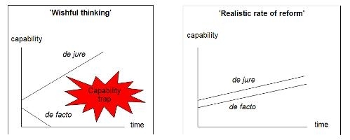 The perfect storm of premature overload, isomorphic mimicry and loss of institutional integrity can lead to a capability trap. 14 The de jure and the de facto become disconnected from each other, and the organization gets stuck in a low-performance equilibrium with external and internal pressures conspiring to maintain the status quo. This is what may happen when pushing too fast for reforms that are incongruent with prevailing rules systems. Exactly the opposite of what is trying to be achieved.