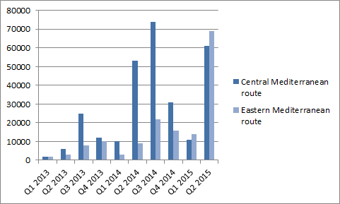 Table 1: Route taken by irregular migrants to the EU 2014–2015 (source: Frontex/UNHCR, 2015)