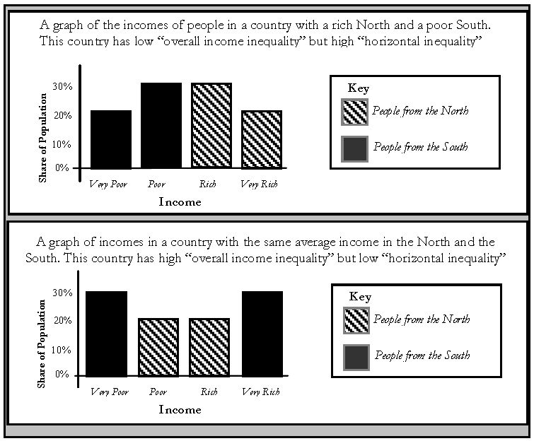 Horizontal inequalities occur between different ethnic, religious or regional groups. Frances Stewart argues that most studies on the link between inequalities and conflict look at the distribution of income across the whole population of countries, which she calls ‘vertical inequalities’ 13 But she finds that inequalities between different groups matter a lot more: “When cultural differences coincide with economic and political differences between groups, this can cause deep resentment that may lead to violent struggles.” 14 A clear example of this is the economic and political inequalities between Hutu and Tutsi groups in Burundi, which led to an intense civil war. The violence in Kenya after the 2007 elections was also fed by inequalities between regions and ethnic groups.