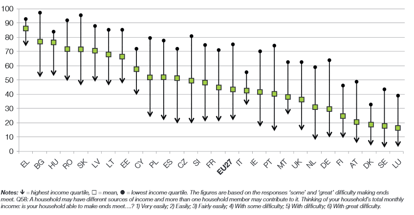 Difficulty making ends meet, by income quartile (%),Eurofound ‘3rd European Quality of Life Survey’ (2012)